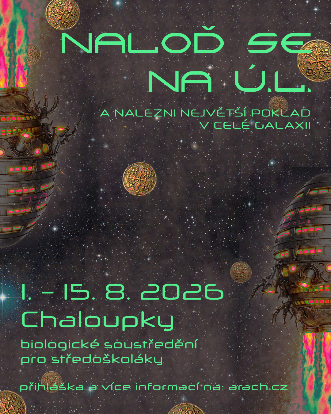 Letní Arachne je 14denní biologické a zážitkové soustředění. Jeho náplní jsou odborné přednášky, terénní exkurze a laboratorní cvičení z různých biologických i biologii příbuzných oborů vedené lektory z řad studentů a pedagogů vysokých škol. Na vlastní kůži si zde vyzkoušíš výzkum formou vědeckých projektů i práci s více či méně běžným laboratorním a terénním vybavením. Kromě odborného programu na tebe čeká velmi pestrý program mimoodborný, ve formě sportovních, logických i kreativních her a aktivit. Soustředění je nejen biologické, nýbrž i zážitkové, tedy fyzicky i psychicky náročné. Může tě potkat přespávání v přírodě, procházka nočním lesem o samotě, stísněné prostory a další dobrodružství. Není se čeho obávat, ale pokud máš specifické situace, které ti nedělají dobře, nezapomeň nám je sdělit v přihláškovém formuláři.